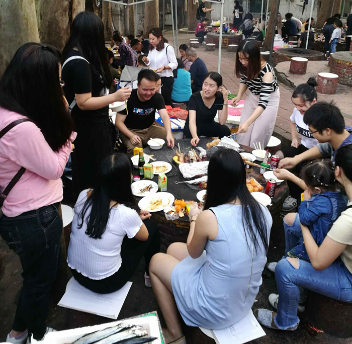 到達(dá)目的地后大家分成4桌落座,燒烤正式開始