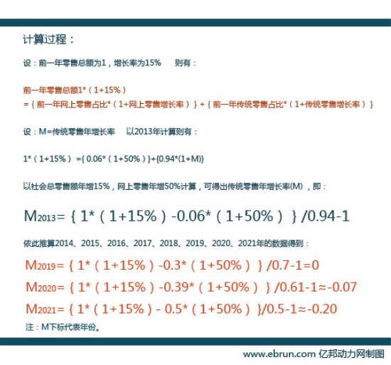 參考網(wǎng)上零售50%的平均年增幅,可以推算傳統(tǒng)線下零售的年增長(zhǎng)率。計(jì)算模型如下: