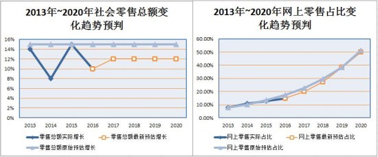 那么,想要達(dá)到50%占比的網(wǎng)上零售總額則需要在2020年達(dá)到約26萬(wàn)億元。也就意味著,未來(lái)4年網(wǎng)上零售的年平均漲幅要達(dá)到約52%,比最初已經(jīng)很難達(dá)到的年增長(zhǎng)50%還要高出約2個(gè)百分點(diǎn)。