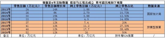 如果2020年網(wǎng)上零售占比達(dá)到50%,傳統(tǒng)零售將在2019年出現(xiàn)負(fù)增長(zhǎng),而在2020年甚至?xí)霈F(xiàn)13%的負(fù)增長(zhǎng)。面對(duì)這樣幾乎不可能實(shí)現(xiàn)的目標(biāo),馬云的信心可還在?