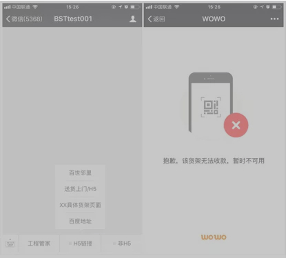 億邦動(dòng)力網(wǎng)隨后查看了百世店加、百世鄰里等官方微信號(hào),均未找到“貨架”入口,但卻在百世店加旗下的另一個(gè)公眾號(hào)“BSTtest”中發(fā)現(xiàn)了一點(diǎn)“痕跡”。該公眾號(hào)中設(shè)有入口“XX具體貨架頁(yè)面”,點(diǎn)擊進(jìn)入后,頁(yè)面顯示“貨架暫時(shí)無法收款”,而頁(yè)面中出現(xiàn)的“WOWO”字樣也疑似貨架的落地地點(diǎn)——百世集團(tuán)在去年收購(gòu)的WOWO便利店。