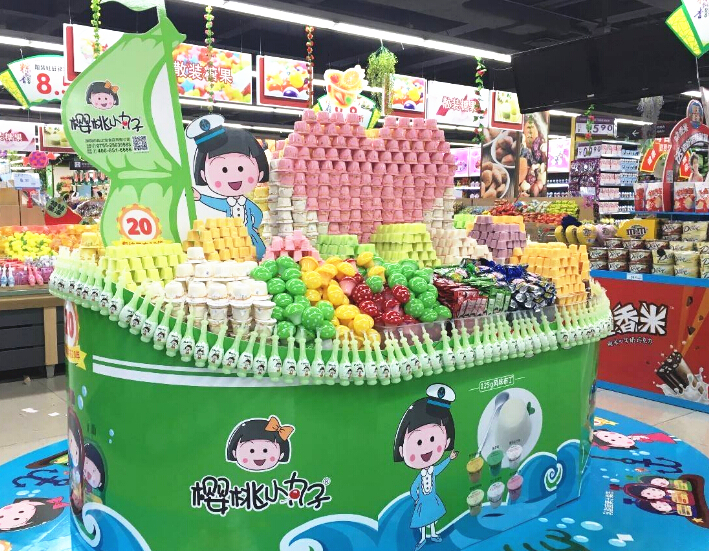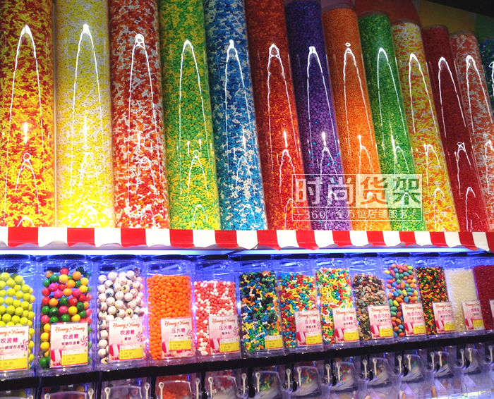 將散裝零食以不同的色彩或造型陳列,彰顯個性化形象,打破超市散裝區(qū)的沉悶和死板,更顯活潑。