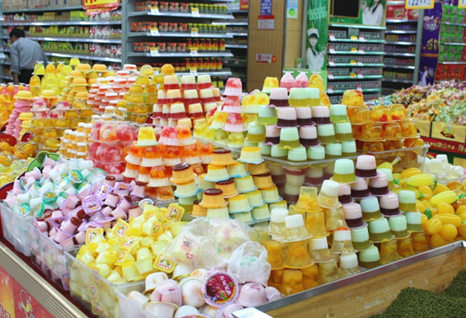 類似果凍這樣的硬包裝類散裝零食可以采用逐層遞增的方式陳列,俗稱步步高陳列。這樣陳列的好處是讓商品展示效果更有層次,美觀性更強(qiáng)。